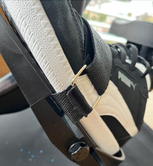 Der Gurt muss so durchgefädelt werden, dass die eckige Öse unter dem Pedal verläuft und an der Außenseite des jeweiligen Pedals sitzt. Nur in dieser Position lässt sich der Gurt mit ausreichendem Zug festziehen.