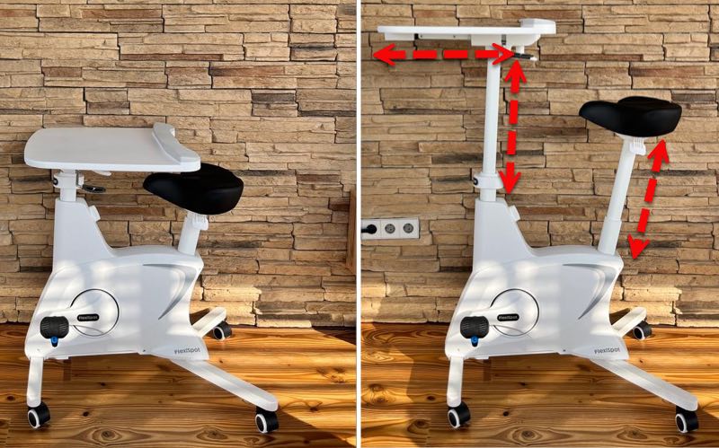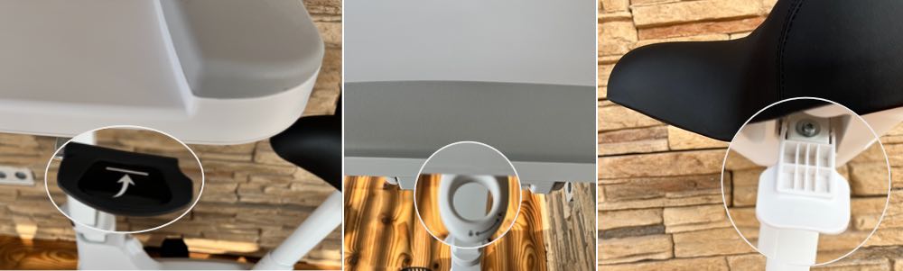 Arbeitsplatte horizontal und vertikal einstellbar. Sattel stufenlos einstellbar. Die Einstellung erfolgt einfach mit einem Hebel.